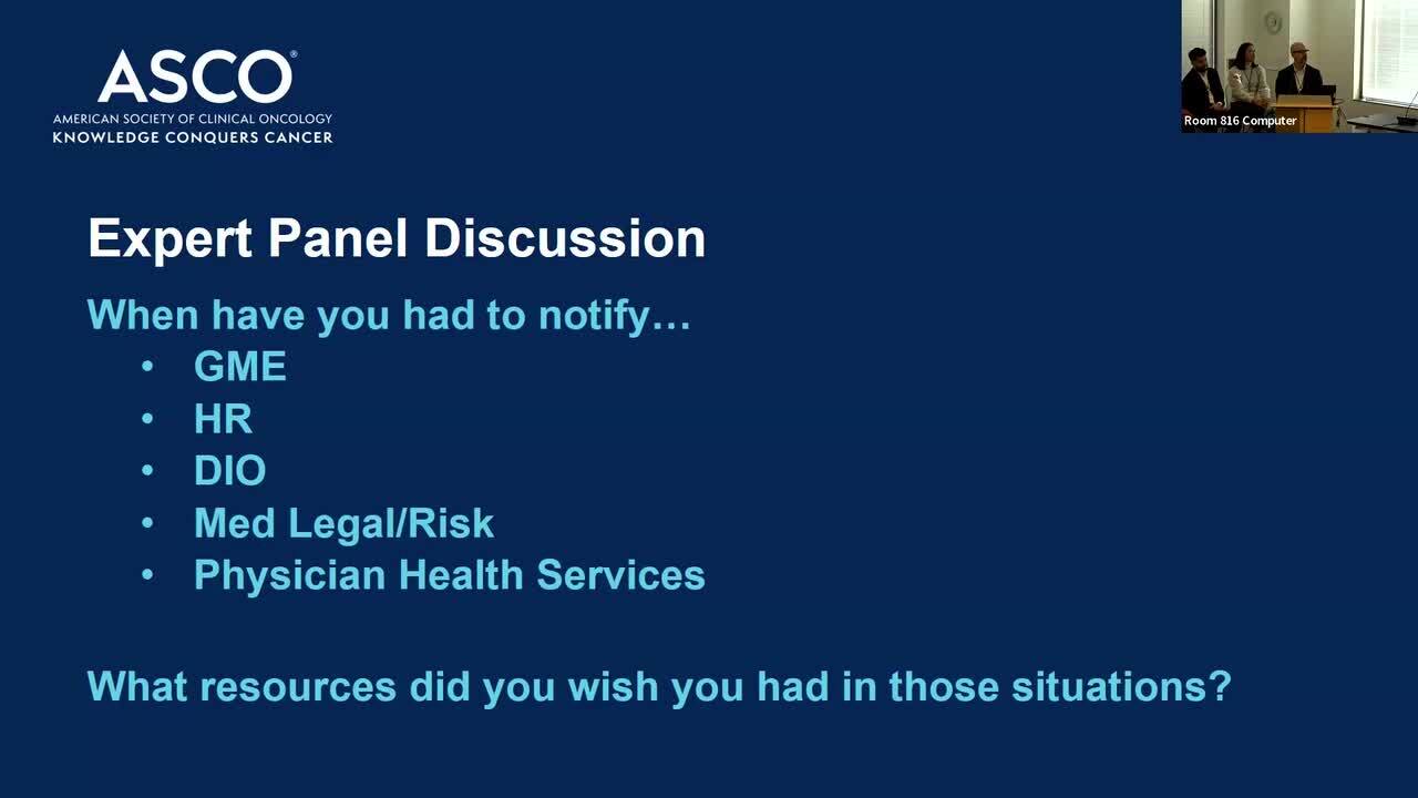 Graduates of the ASCO Leadership Development: Education Scholars program, Drs. Anthony Lott, Ida Wong-Sefidan, Jed Katzel, and Karine Tawagi conduct a workshop on how to develop a Supportive Action Plan (SAP) for fellows in difficulty.